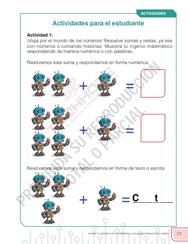 Unidad 1: Introducci%u00f3n a la Rob%u00f3tica y conceptos b%u00e1sicos de los robots 17ACTIVIDADES+++===Resolvamos esta suma y respondamos en forma num%u00e9rica. Resolvamos esta suma y respondamos en forma de texto o escrita.Actividades para el estudianteActividad 1:%u00a1Viaja por el mundo de los n%u00fameros! Resuelve sumas y restas, ya sea con n%u00fameros o contando historias. Muestra tu ingenio matem%u00e1tico respondiendo de manera num%u00e9rica o con palabras.C tPROHIBIDA SU REPRODUCCI%u00d3N TOTAL O PARCIAL