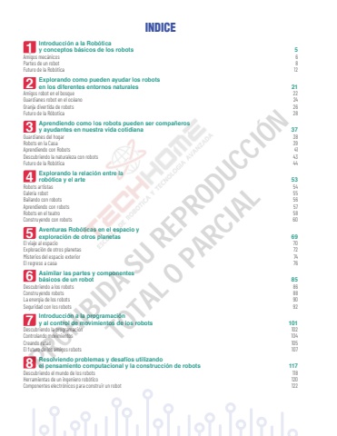 INDICEIntroducci%u00f3n a la Rob%u00f3tica y conceptos b%u00e1sicos de los robots 5Amigos mec%u00e1nicos 6Partes de un robot 8Futuro de la Rob%u00f3tica 12Explorando como pueden ayudar los robots en los diferentes entornos naturales 21Amigos robot en el bosque 22Guardianes robot en el oc%u00e9ano 24Granja divertida de robots 26Futuro de la R%u00f3botica 28Aprendiendo como los robots pueden ser compa%u00f1erosy ayudantes en nuestra vida cotidiana 37Guardianes del hogar 38Robots en la Casa 39Aprendiendo con Robots 41Descubriendo la naturaleza con robots 43Futuro de la Rob%u00f3tica 44Explorando la relaci%u00f3n entre la rob%u00f3tica y el arte 53Robots artistas 54Galer%u00eda robot 55Bailando con robots 56Aprendiendo con robots 57Robots en el teatro 58Construyendo con robots 60Aventuras Rob%u00f3ticas en el espacio y exploraci%u00f3n de otros planetas 69El viaje al espacio 70Exploraci%u00f3n de otros planetas 72Misterios del espacio exterior 74El regreso a casa 76Asimilar las partes y componentesb%u00e1sicos de un robot 85Descubriendo a los robots 86Construyendo robots 88La energ%u00eda de los robots 90Seguridad con los robots 92Introducci%u00f3n a la programaci%u00f3n y al control de movimientos de los robots 101Descubriendo la programaci%u00f3n 102Controlando movimientos 104Creando rutas 105El futuro de los amigos robots 107Resolviendo problemas y desaf%u00edos utilizando el pensamiento computacional y la construcci%u00f3n de robots 117Descubriendo el mundo de los robots 118Herramientas de un ingeniero rob%u00f3tico 120Componentes electr%u00f3nicos para construir un robot 122 12345678PROHIBIDA SU REPRODUCCI%u00d3N TOTAL O PARCIAL