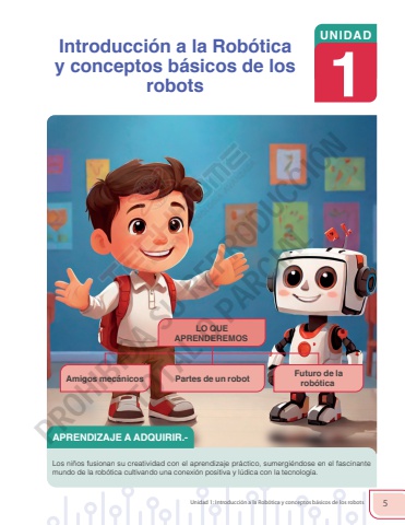 UNIDAD1Unidad 1: Introducci%u00f3n a la Rob%u00f3tica y conceptos b%u00e1sicos de los robots 5Los ni%u00f1os fusionan su creatividad con el aprendizaje pr%u00e1ctico, sumergi%u00e9ndose en el fascinante mundo de la rob%u00f3tica cultivando una conexi%u00f3n positiva y l%u00fadica con la tecnolog%u00eda.APRENDIZAJE A ADQUIRIR.-Introducci%u00f3n a la Rob%u00f3tica y conceptos b%u00e1sicos de los robotsLO QUE APRENDEREMOSAmigos mec%u00e1nicos Partes de un robot Futuro de la rob%u00f3ticaPROHIBIDA SU REPRODUCCI%u00d3N TOTAL O PARCIAL