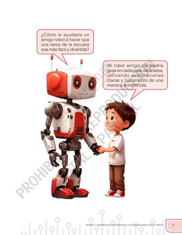 Unidad 1: Introducci%u00f3n a la Rob%u00f3tica y conceptos b%u00e1sicos de los robots 7%u00bfC%u00f3mo le ayudar%u00eda un amigo robot a hacer que una tarea de la escuela sea m%u00e1s f%u00e1cil y divertida?Mi robot amigo me podr%u00eda guiar en cada paso de la tarea, utilizando explicaciones claras y haci%u00e9ndolo de una manera entretenida.PROHIBIDA SU REPRODUCCI%u00d3N TOTAL O PARCIAL