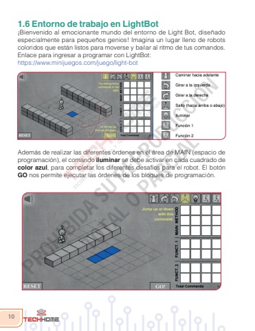 101.6 Entorno de trabajo en LightBot%u00a1Bienvenido al emocionante mundo del entorno de Light Bot, dise%u00f1ado especialmente para peque%u00f1os genios! Imagina un lugar lleno de robots coloridos que est%u00e1n listos para moverse y bailar al ritmo de tus comandos. Enlace para ingresar a programar con LightBot: https://www.minijuegos.com/juego/light-bot Adem%u00e1s de realizar las diferentes %u00f3rdenes en el %u00e1rea de MAIN (espacio de programaci%u00f3n), el comando iluminar se debe activar en cada cuadrado de color azul, para completar los diferentes desaf%u00edos para el robot. El bot%u00f3n GO nos permite ejecutar las %u00f3rdenes de los bloques de programaci%u00f3n. PROHIBIDA SU REPRODUCCI%u00d3N  TOTAL O PARCIAL