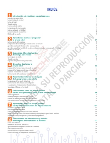 INDICEIntroducci%u00f3n a la rob%u00f3tica y sus aplicaciones 5Descubramos a los robots 6Caracter%u00edsticas de un robot 6Partes del robot 7Tipos de robots 8Programaci%u00f3n de robots 9Herramientas de programaci%u00f3n 9Entorno de trabajo en LightBot 10Caracter%u00edsticas de un algoritmo: 11El futuro de los robots 12Aprendiendo a armar y programar tu propio robot 21La importancia de la robotica 22Componentes de la rob%u00f3tica y su relaci%u00f3n con el ser humano 24Aprendamos a instalar Scratch 3.0 en la computadora 25Aprendamos a utilizar Scratch 3.0 mediante online sin necesidad de descargarlo e instalarlo 26Interfaz del Scratch 3.0 27Explorando diferentes fuentes de energ%u00eda para robots 37La energ%u00eda en los robots 38Tipos de energ%u00edas 39Seguridad al explorar robots y electricidad 44Creando y dise%u00f1ando tupropio robot 53Explorando las formas y proporciones de los robots 54Explorando las figuras geom%u00e9tricas en los robots 55Expresi%u00f3n emocional en los robots: 56La importancia de la creatividad en la Rob%u00f3tica 59Resolviendo misterios con la ayudade la programaci%u00f3n de robots 69Herramientas de los robots detectives 70La importancia de la %u00e9tica en la investigaci%u00f3n y su aplicaci%u00f3n al trabajo de los robots detectives 72Tecnolog%u00edas utilizadas en los robots 73Descubriendo como los robots pueden ayudar a las personas y hacer el bien en la sociedad 85Robots Superh%u00e9roes 86El trabajo en equipo entre humanos y robots 87Roles de los Robots y humanos en la vida cotidiana 88Valores importantes de los humanos relacionados con los robots 90Aprendiendo como los robots pueden ayudar en la conservaci%u00f3n del medio ambiente 101La rob%u00f3tica con la naturaleza 102Educaci%u00f3n ambiental y robots 104Robots dise%u00f1ados para limpieza del medio ambiente 105Importancia de la colaboraci%u00f3n entre humanos y robots para proteger el medio ambiente 106Explorando Blockly: Navegando la plataforma de programaci%u00f3n 108Descubriendo las innovaciones y avances tecnol%u00f3gicos en el campo de la rob%u00f3tica 117Futuro en la Rob%u00f3tica 118Inteligencia artificial en la Rob%u00f3tica: 118Aplicaciones en la inteligencia artificial en la rob%u00f3tica 119El mundo de la Electr%u00f3nica 120Descubriendo los componentes electr%u00f3nicos: 120Circuito utilizando los componentes electr%u00f3nicos: 121 12345678PROHIBIDA SU REPRODUCCI%u00d3N  TOTAL O PARCIAL