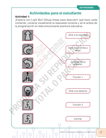 Unidad 1 : Introducci%u00f3n a la rob%u00f3tica y sus aplicaciones 17ACTIVIDADESActividades para el estudianteActividad 1:%u00a1Explora con Light Bot! Dibuja l%u00edneas para descubrir qu%u00e9 hace cada comando, conecta visualmente la respuesta correcta y s%u00e9 el artista de la programaci%u00f3n en %u00e9sta emocionante aventura educativa.Girar a la izquierdaSalto hacia arriba o abajoCaminar hacia adelanteFunci%u00f3n 1Girar a la derechaFunci%u00f3n 2IluminarPROHIBIDA SU REPRODUCCI%u00d3N  TOTAL O PARCIAL