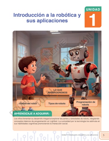 UNIDAD1Unidad 1 : Introducci%u00f3n a la rob%u00f3tica y sus aplicaciones 5Los ni%u00f1os fomentan su desarrollo integral al explorar las partes y variedades de robots, integrando conceptos b%u00e1sicos de programaci%u00f3n en Lightbot. La curiosidad por la tecnolog%u00eda los estimula en sus habilidades cognitivas promoviendo la interacci%u00f3n social.APRENDIZAJE A ADQUIRIR.-Introducci%u00f3n a la rob%u00f3tica y sus aplicacionesLO QUE APRENDEREMOSPartes del robot Tipos de robots Programaci%u00f3n de robotsPROHIBIDA SU REPRODUCCI%u00d3N TOTAL O PARCIAL