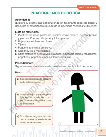 Unidad 1 : Introducci%u00f3n a la rob%u00f3tica y sus aplicaciones 13PRACTIQUEMOSPRACTIQUEMOS ROB%u00d3TICAActividad 1: %u00a1Explora tu creatividad construyendo un fascinante robot de papel y descubre el emocionante mundo de la ingenier%u00eda mientras te diviertes!Lista de materiales:1. Plantillas de robot: partes de un robot, como cabeza, cuerpo, brazos y piernas. Puedes dibujarlas y fotocopiarlas.2. Hojas de cartulinas a colores.3. Tijeras.4. Pegamento o cinta adhesiva.5. Ojos m%u00f3viles o marcadores.6. Otros materiales decorativos: crayones, l%u00e1pices de colores, rotuladores, pegatinas, papel de aluminio, lentejuelas, etc.a) Selecciona una hoja de cartulina de tu color preferido.b) Utiliza un l%u00e1piz para dibujar la figura principal del robot, como ser un rect%u00e1ngulo grande o usa tu creatividad.c) Con tijeras seguras, recorta cuidadosamente alrededor del dibujo en la cartulina.Paso 1:Procedimiento:Sigue las intrucciones de cada paso hasta crear tu robot de papel.PROHIBIDA SU REPRODUCCI%u00d3N TOTAL O PARCIAL